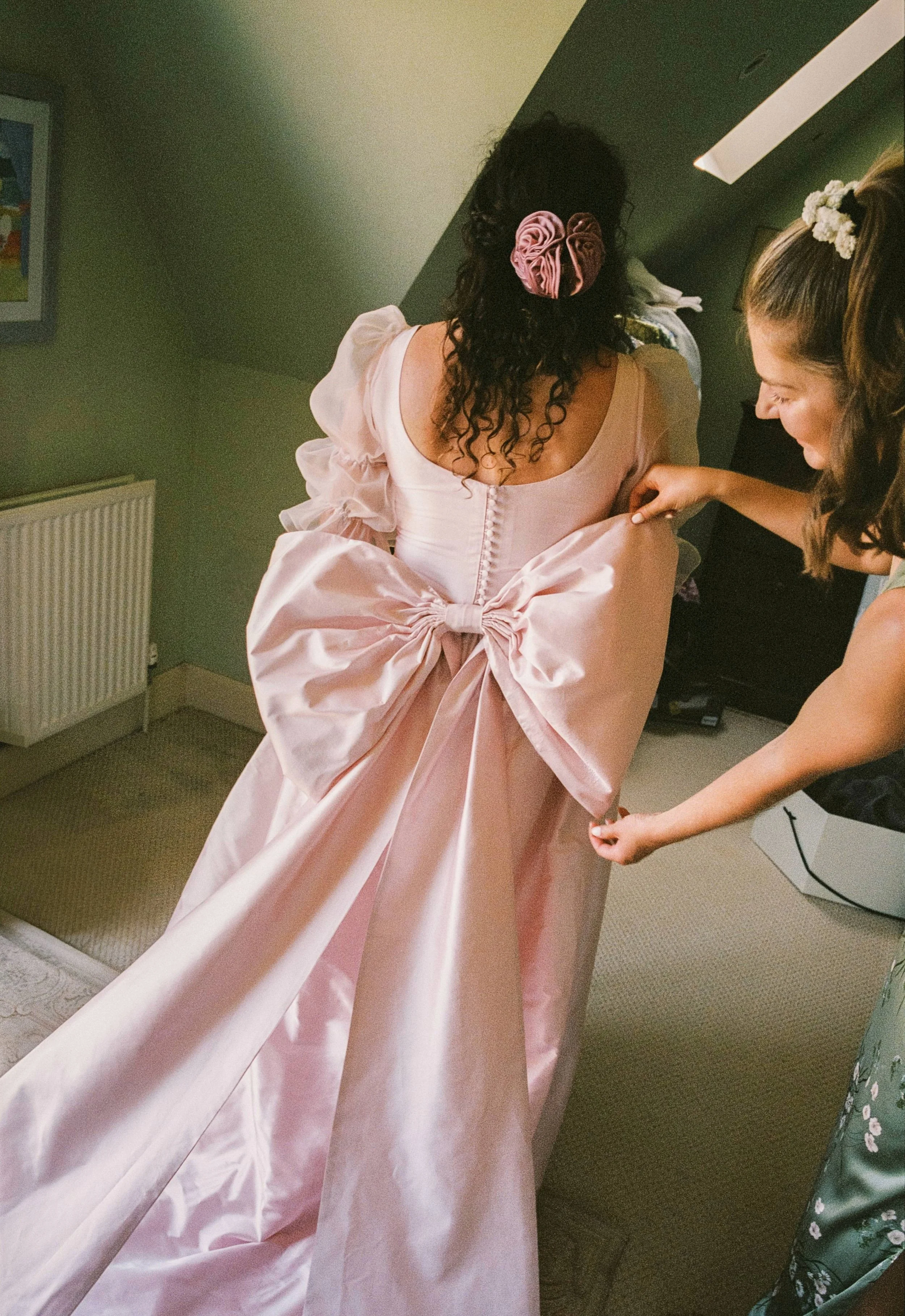 “I first visited her studio in April 2024, and knew that she’d be able to make the dress of my dreams! I didn’t want something too fussy and loved her elegant and sleek designs, settling on the Clementine. As it was more of a wedding ‘party’ (we were getting officially married on a different day), I also didn’t want something too formal or traditional, and my sister suggested we try the dress in a different colour. Coco was so good at explaining all the options and I really felt like she put my priorities first, and the pearly pink dress of dreams was created! She also suggested I lengthen the sleeves as it was a winter wedding, which really added to the overall look. The whole process from start to finish was so simple, unlike many of the stories I hear from friends! Coco made me immediately at ease, and it was such a joy to visit her studio and do try ons as the dress progressed. It really was everything I had hoped for, and I cannot recommend her enough! Thank you Coco 💕”